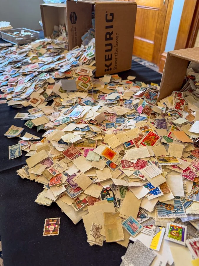 Everyone was asked to bring an envelope of materials to share, but I also got a lot from the San Jose Stamp Club, including loads of postage stamps.