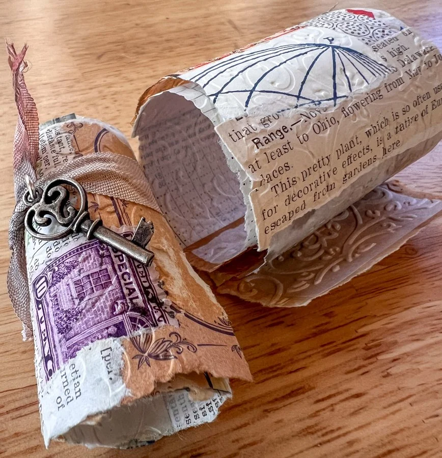 This month in the Vintage & Collage Club we are taking our scraps and making snippet rolls. What are they? They are strips of collaged scraps that are rolled up.